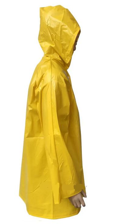 Capa de segurança confeccionada em PVC, mangas longas, capuz, fechamento frontal com quatro botões plásticos de pressão, costuras através de solda eletrônica.Proteção do tronco e membros superiores do usuário contra umidade proveniente de operações com uso de água e contra agentes meteorológicos.••••• Especificações •••••